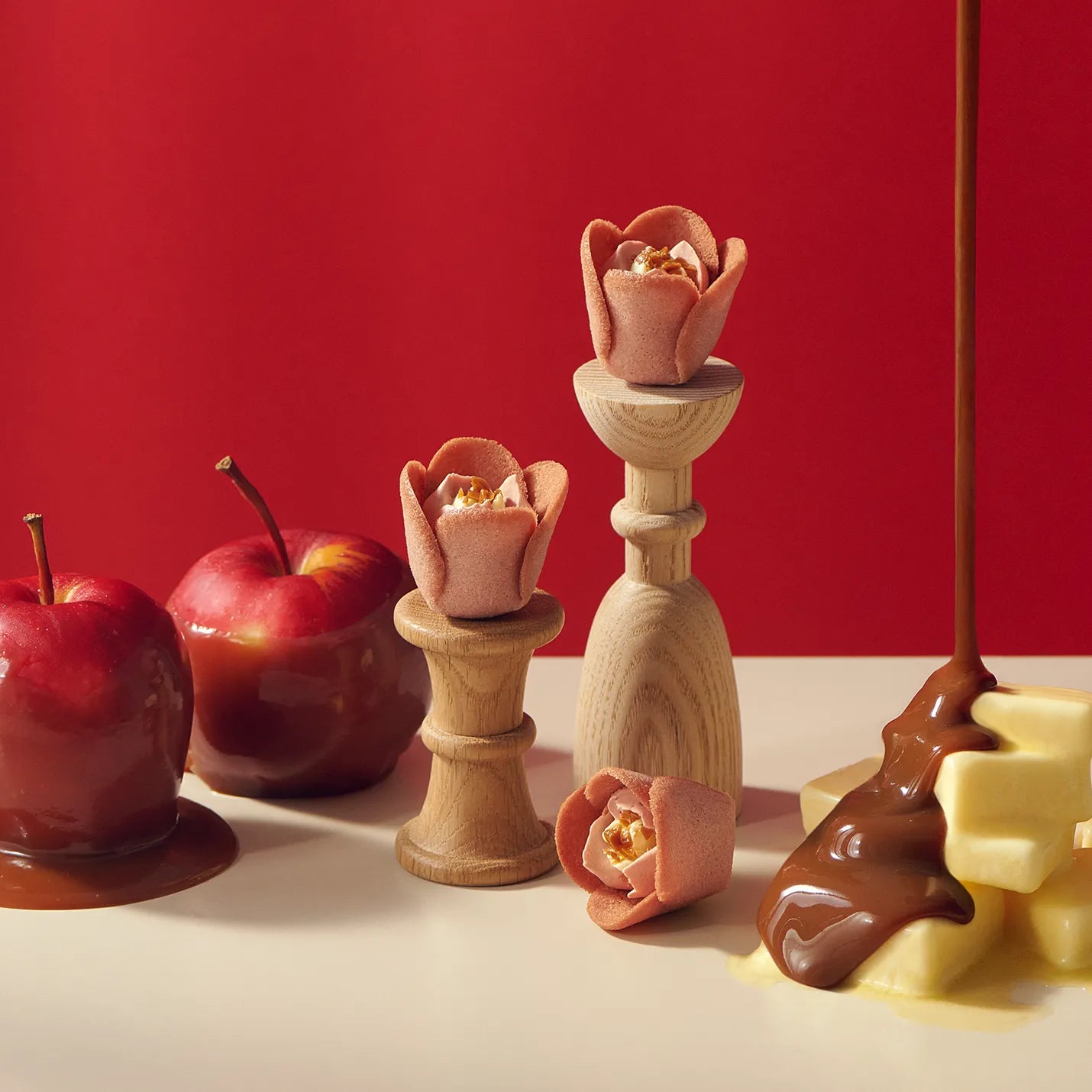 Delicate langue de chat cookies infused with caramel-flavored French fermented butter provide the perfect canvas for Tokyo Tulip Rose's artfully piped chocolate cream. Infused with apple and butter notes, this creation captures the essence of warm baked apples glazed in rich caramel. Each bite delivers an elegant interplay of textures—crisp, buttery wafers yielding to silky cream—while the aromatic profile evokes the comforting indulgence of caramelized fruit and melted butter.
